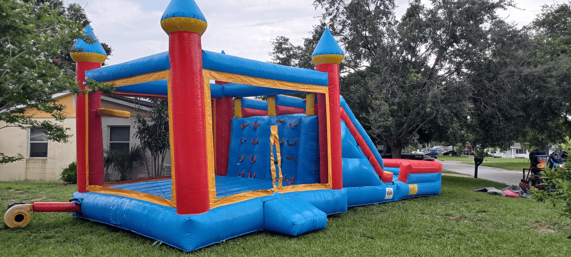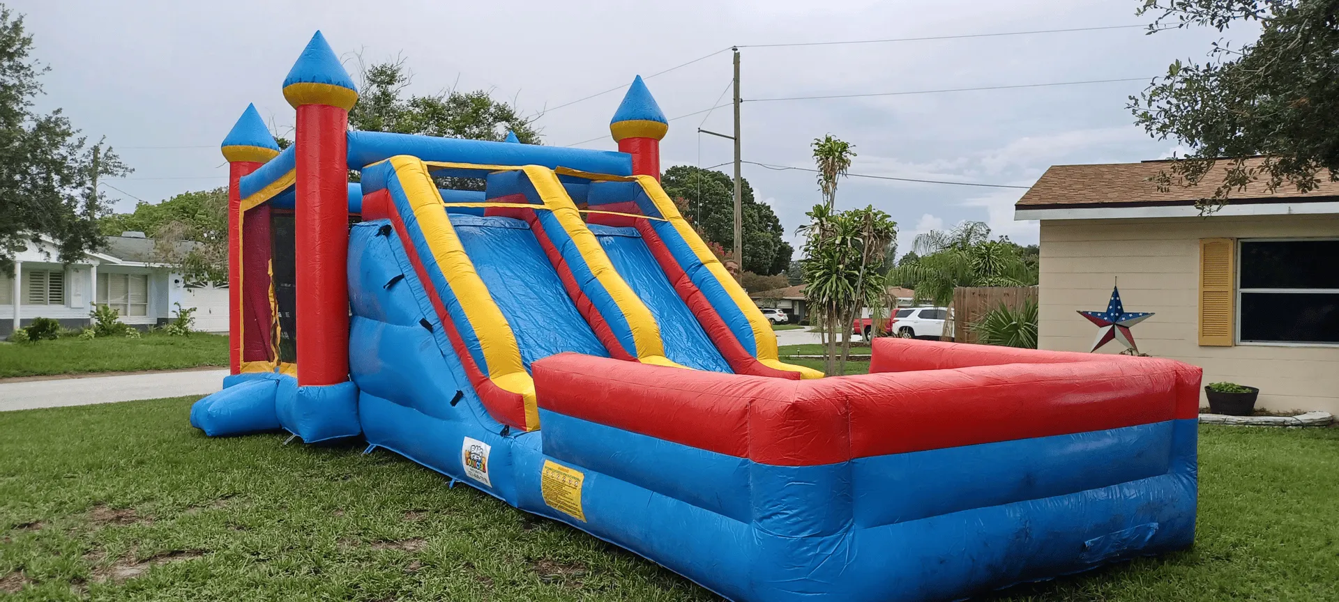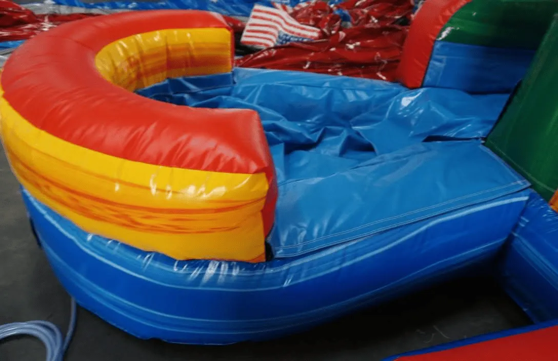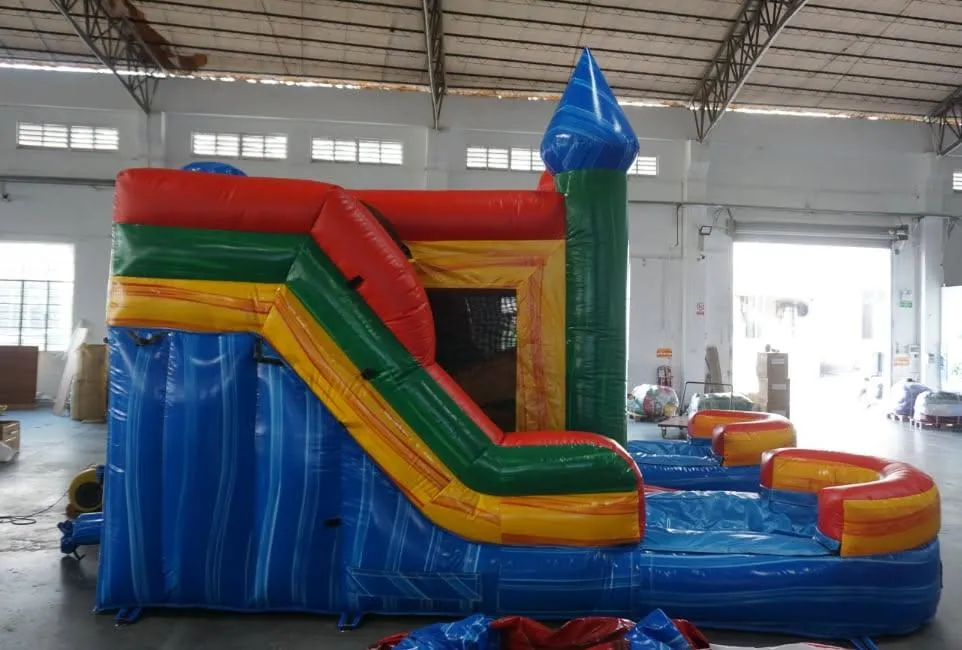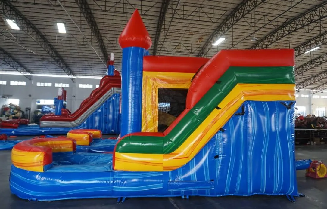 Enjoy yourself with this primary-colored bounce and dual slide combo. With a large inflated pool at the end of the slide and a steep climbing wall, your older-aged guests can have a great wet and wild time.