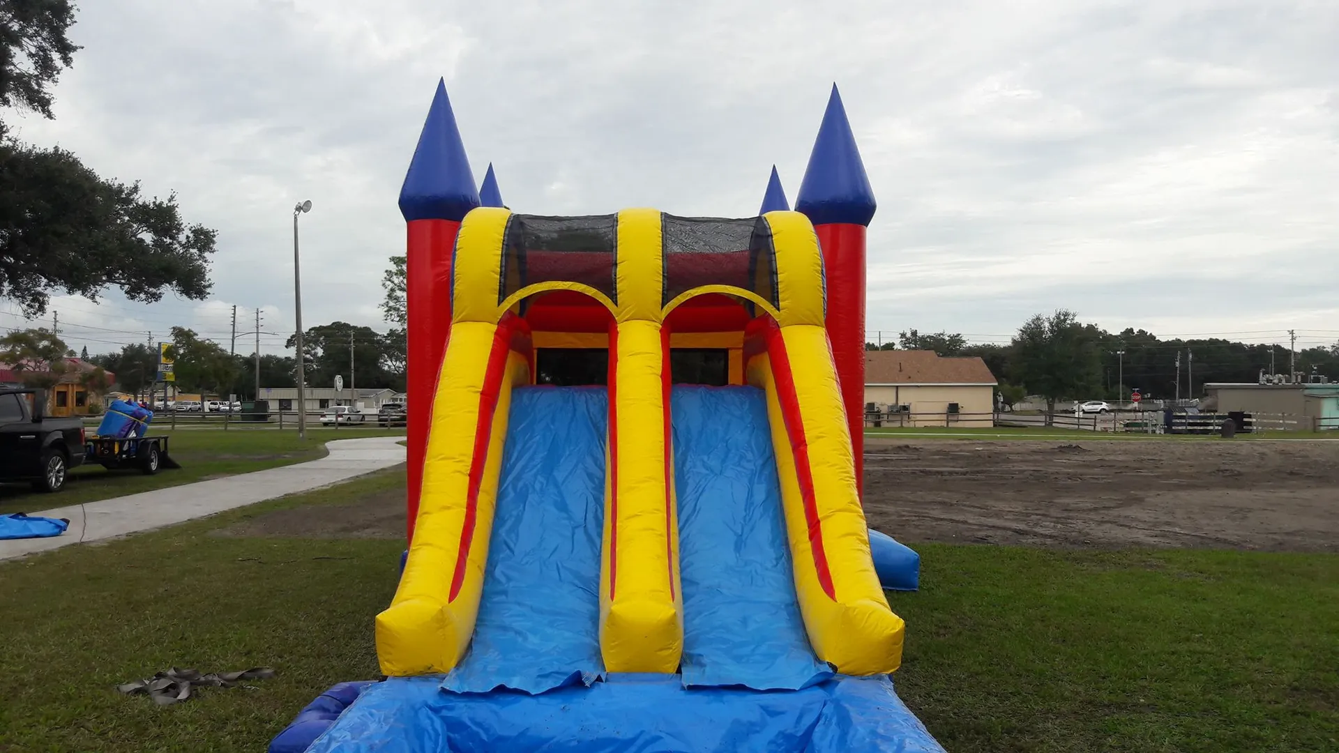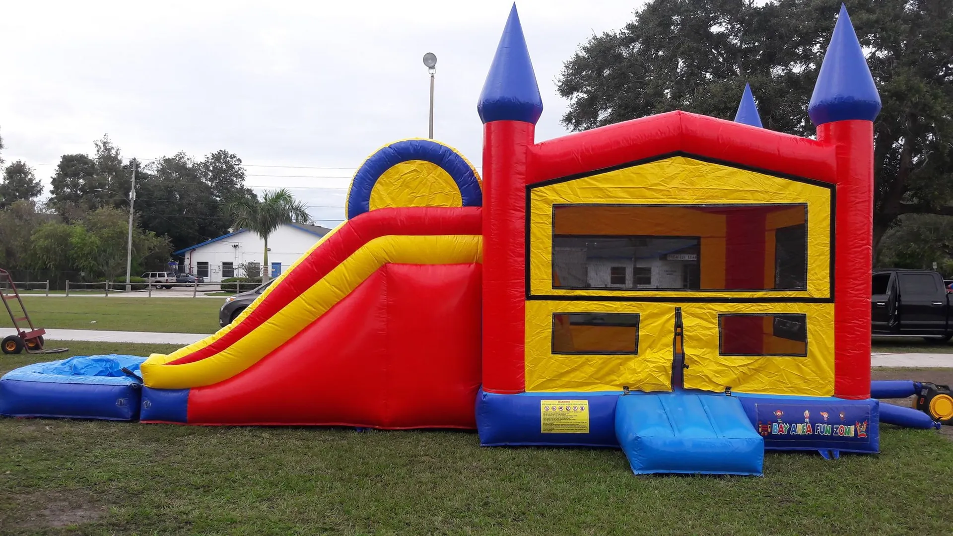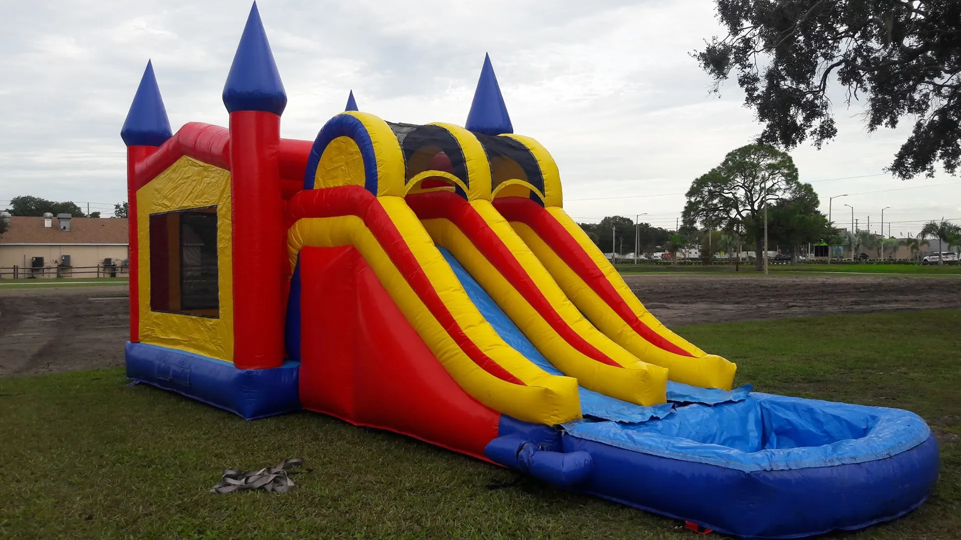 Enjoy yourself with this primary-colored bounce and dual slide combo. With a large inflated pool at the end of the slide and a steep climbing wall, your older-aged guests can have a great wet and wild time.