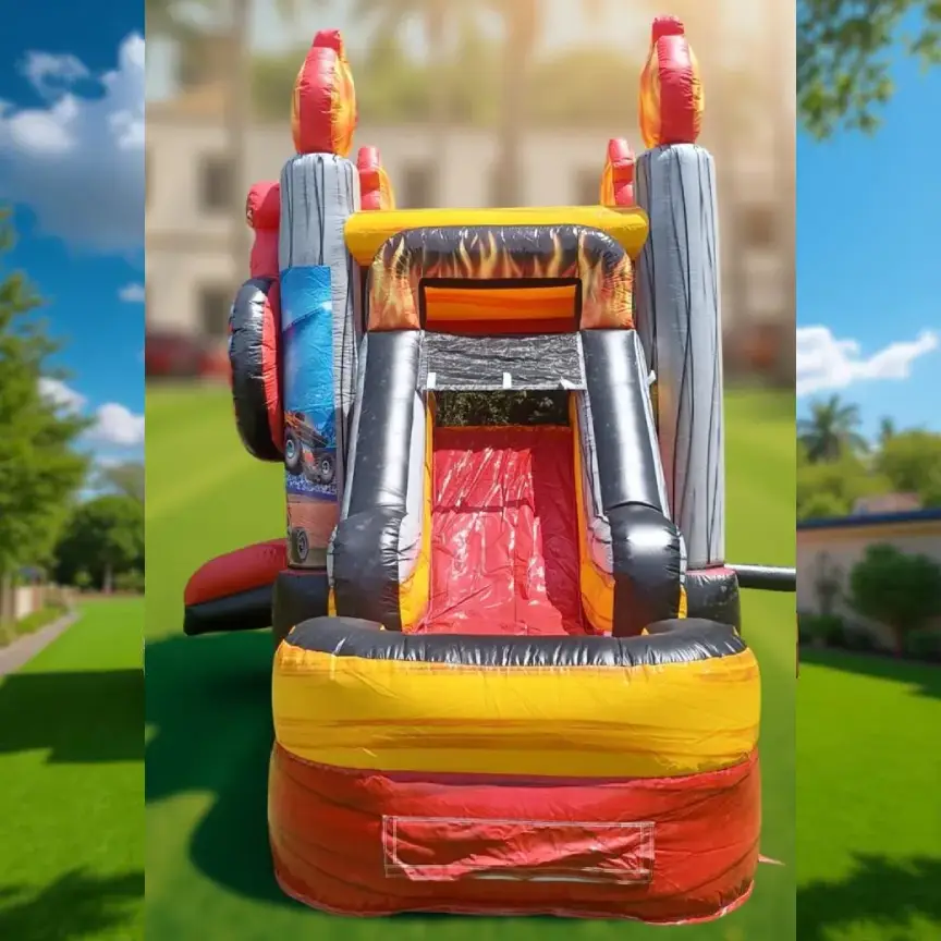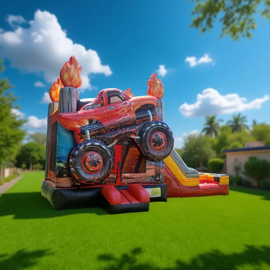 Monster Truck Wet/Dry Combo single lane commercial-grade moonwalk jumper for party rentals. Our Monster Truck Wet/Dry Combo is a thrilling and versatile inflatable that’s perfect for any event. This unique combo features a monster truck theme and can be used as a dry or wet slide, making it perfect for year-round entertainment.