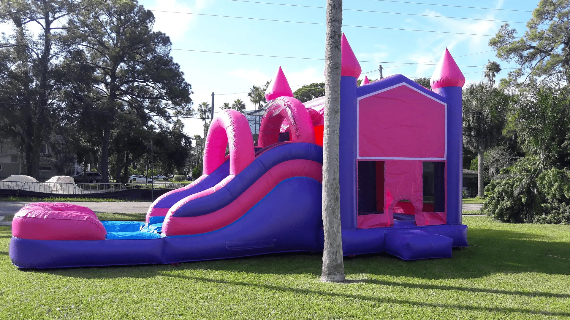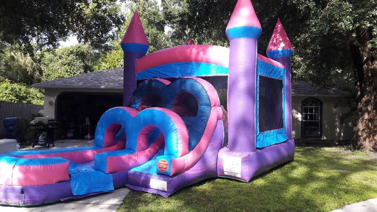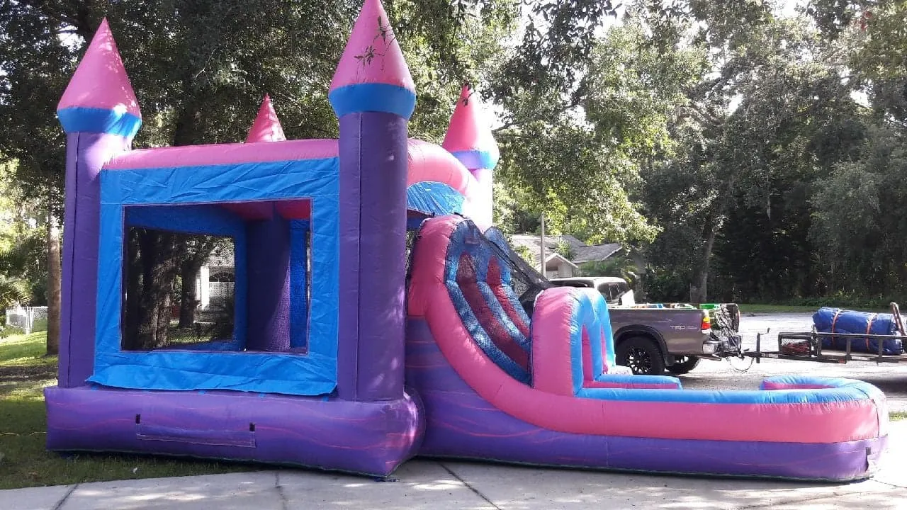 This commercial-grade unit has a pink and lavender color scheme and features a 13′ x 13′ jumping area and a wet/dry slide with attached pool and climbing elements inside. This magical combo is great for fairy tale–themed parties and provides hours of fun for everyone!