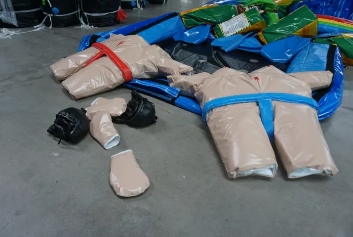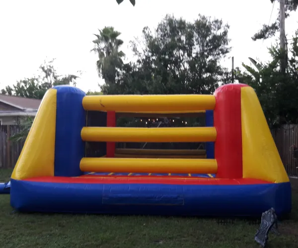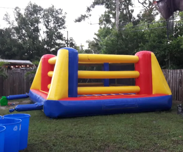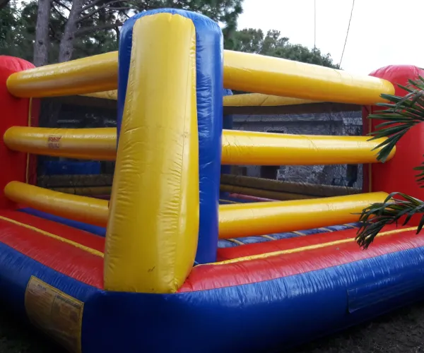 This colorful interactive game brings the joy of a bouncy house together with the world of boxing. Participants can experience a few rounds in the ring with this inflatable play structure, offering a comical and entertaining take on the sport. This bright inflatable play structure features a yellow, blue, and red motif, with four posts and inflatable “ropes.”